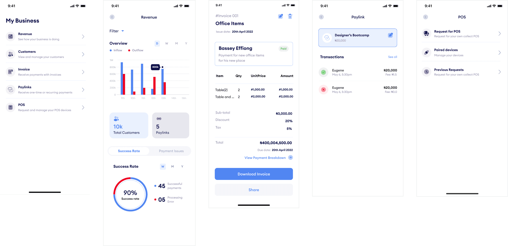 We created a menu item called, "My Business." It is designed to serve as a central hub for essential business tools and analytics, significantly improving feature discoverability and navigation for businesses. The first screen below include a Business Essentials Menu on the left-hand side, listing core features such as Revenue, Customers, Invoices, Paylinks, and POS. This menu offers quick access to these tools, making it easier for users to navigate and find relevant features. The Revenue screen provides a comprehensive overview of financial performance, with visual charts and key metrics like inflow, outflow, success rate, and payment issues displayed upfront for quick insights.