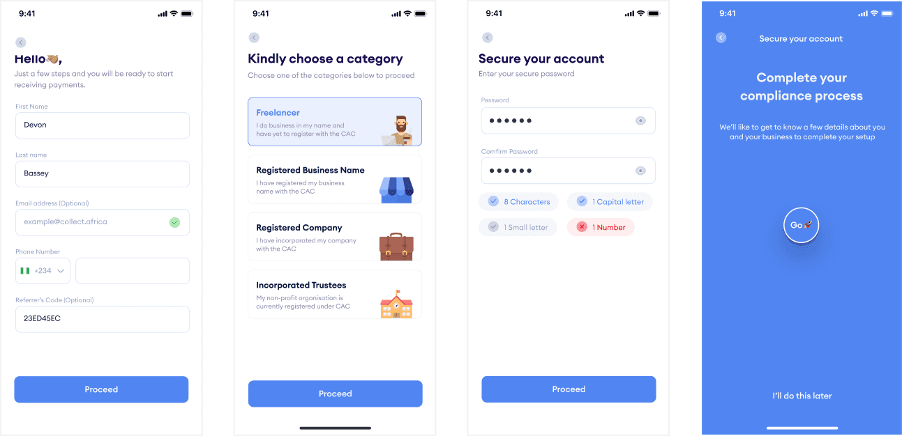 For the onboarding process, I aimed to strike a balance between gathering the necessary information and providing a seamless user experience. The primary goals were to ensure account security, comply with relevant regulations, and minimize user friction.