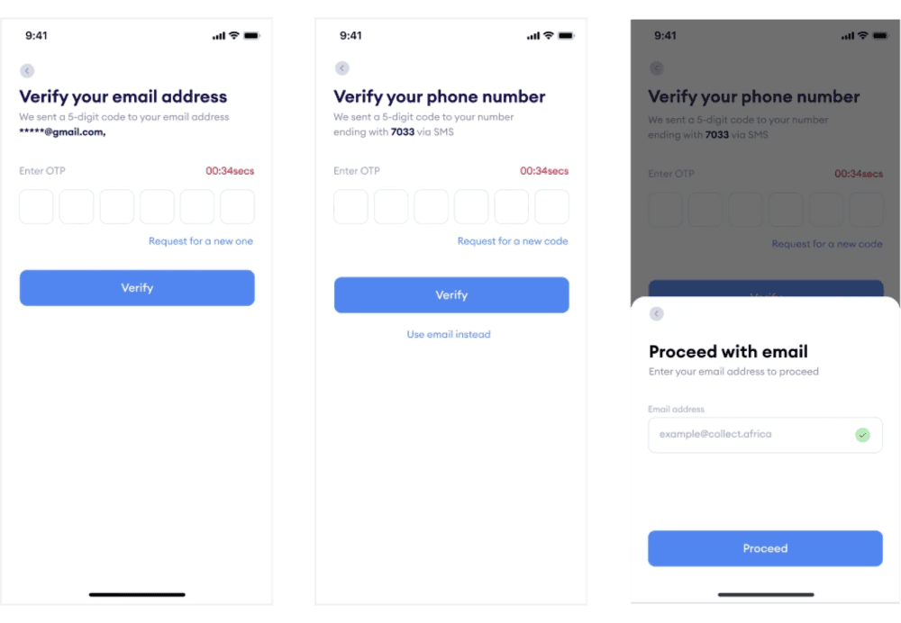 Offering the choice between phone number and email verification caters to user preferences and ensures a smooth verification process. The dedicated verification screens guide users through entering the received codes, reinforcing the security aspect.