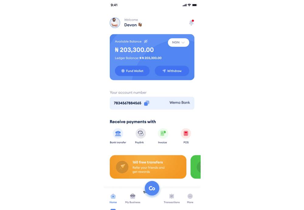 Clear icons and labels for various payment receipt options, such as bank transfers, Paylink, invoices, and POS, enhance the discoverability of these features. A referral prompt at the bottom of the screen encourages user engagement by offering rewards for referrals. The bottom navigation bar provides easy access to the main sections of the app, including Home, My Business, Transactions, and More, ensuring consistent and efficient navigation.
