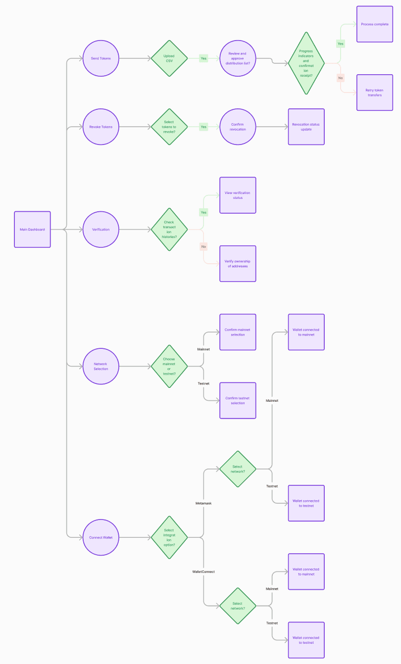 Creating an intuitive and efficient user flow was a critical aspect of our design process. By closely analyzing user behaviors and needs, we developed a streamlined journey that allows users to achieve their goals with minimal friction. This flow addresses key pain points such as time-consuming processes and high transaction costs, ensuring a seamless experience from start to finish. Our user flow reflects the practical requirements of our target audience, including bounty managers, event planners, airdrop coordinators, crypto traders, and community managers, by simplifying token distribution and automating repetitive tasks. This user-centric approach enhances usability and satisfaction, making the application both powerful and easy to use.