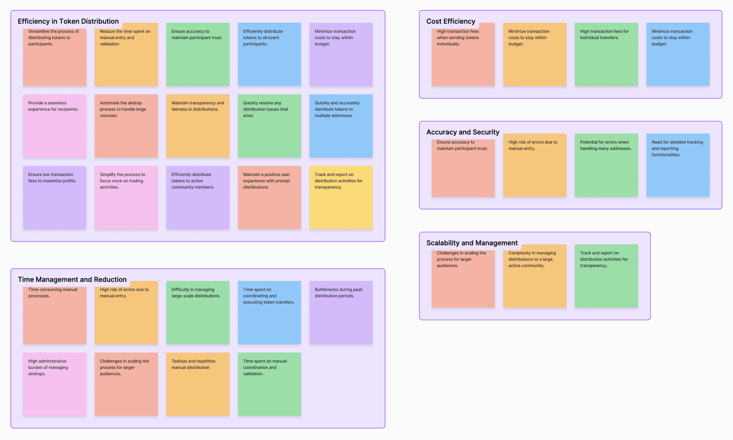 To better understand and address the diverse needs and challenges faced by our target users, we conducted an affinity mapping exercise. This process involved collecting detailed feedback from various personas, including bounty managers, event planners, airdrop coordinators, crypto traders, and community managers. We then grouped this feedback into common themes to identify key areas for improvement and innovation. The main themes that emerged from our affinity mapping were efficiency in token distribution, time management and reduction, cost efficiency, accuracy and security, and scalability and management. This structured approach allowed us to pinpoint the most critical pain points and goals of our users, providing a clear direction for designing a solution that effectively meets their needs.